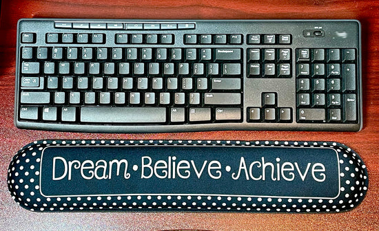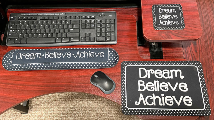 Computer Desk Mats, Set of 3, 1 ea Mouse Pad, 1 ea Keyboard Wrist Pad, 1 ea Coaster, Dream, Believe, Achieve, Black with White Dots, The keyboard wrist rest and mouse pad are made of memory foam. The keyboard wrist rest is stable and easy to use. It bounces slowly, providing lasting support for the wrist. The fabric on the surface is very light, soft and durable. Smooth surface allows the mouse to move more accurately.The edges are reinforced to prevent deformation and damage.That's really high quality!