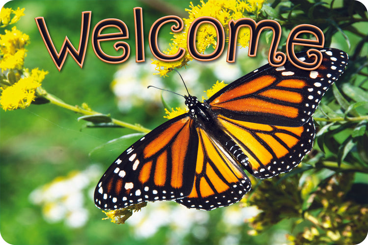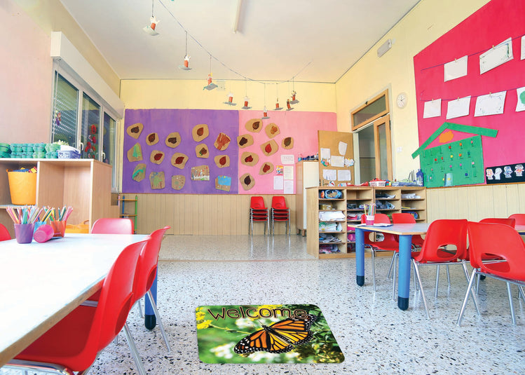 The Original Fun Mat, Welcome Mat, 15.5" x 23.5", Butterfly Welcome, Transform Your Classroom with our Vibrant Decorative Floor Mats! Elevate your learning environment with our eye-catching and durable floor mats designed to inspire and engage students. The slip-resistant, heavy rubber backing ensures safety, while the absorbent, printed soft surface makes cleaning a breeze.
