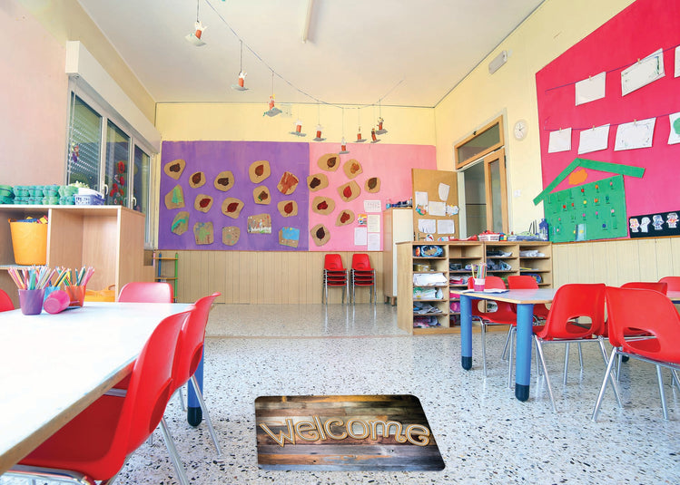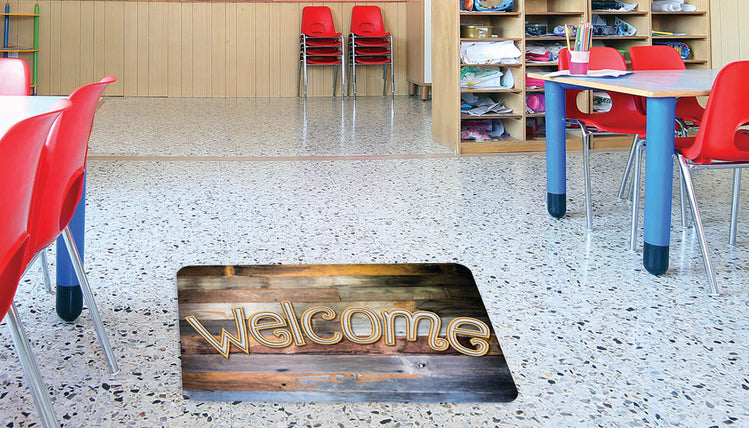 The Original Fun Mat, Welcome Mat, 15.5" x 23.5", Reclaimed Wood Welcome, Transform Your Classroom with our Vibrant Decorative Floor Mats! Elevate your learning environment with our eye-catching and durable floor mats designed to inspire and engage students. The slip-resistant, heavy rubber backing ensures safety, while the absorbent, printed soft surface makes cleaning a breeze.