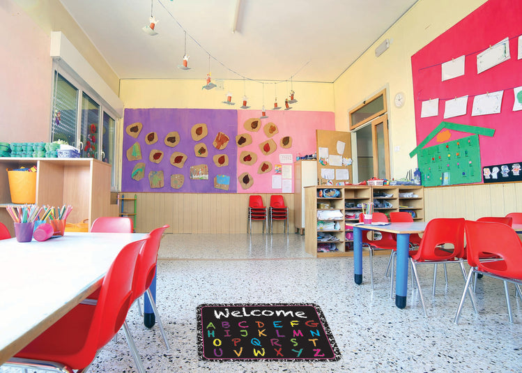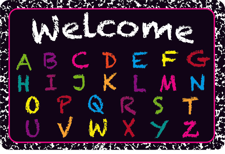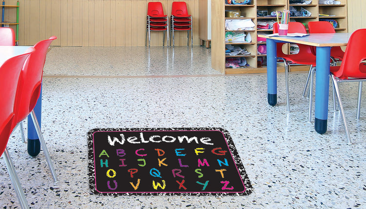 The Original Fun Mat, Welcome Mat, 15.5" x 23.5", Chalk Alphabet Welcome, Transform Your Classroom with our Vibrant Decorative Floor Mats! Elevate your learning environment with our eye-catching and durable floor mats designed to inspire and engage students. The slip-resistant, heavy rubber backing ensures safety, while the absorbent, printed soft surface makes cleaning a breeze.