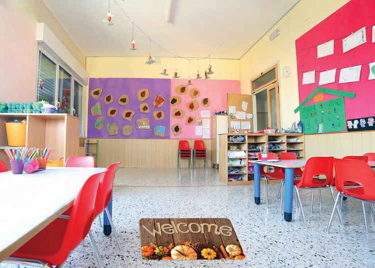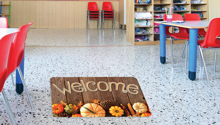 The Original Fun Mat, Welcome Mat, 15.5" x 23.5", Pumpkin Wood Welcome, Transform Your Classroom with our Vibrant Decorative Floor Mats! Elevate your learning environment with our eye-catching and durable floor mats designed to inspire and engage students. The slip-resistant, heavy rubber backing ensures safety, while the absorbent, printed soft surface makes cleaning a breeze.