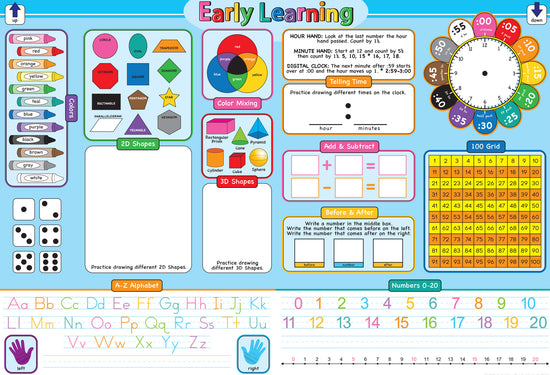 93708 Early Learning, Smart Poly, Learning Mat, 13" x 19", Heavy duty Single sided surface for fun and colorful learning. Write-on/ wipe-off surface. Use with dry erase or water based markers and washable crayons.