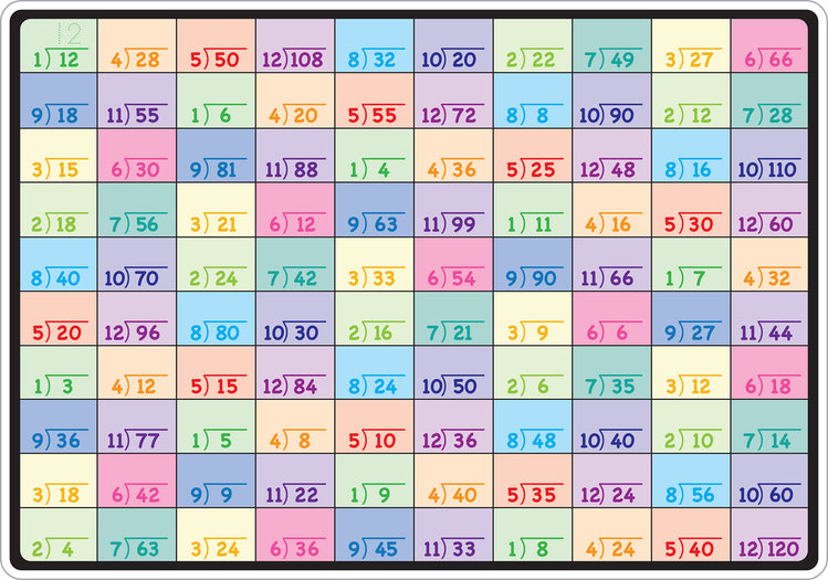 95007 Math Division Tables , Smart Poly® Learning Mat 12"x17", Double-Sided, Multiplication Tables , Heavy duty double-sided surface for fun and colorful learning on both sides. Write-on/ wipe-off surface. Use with dry erase or water based markers and washable crayons. Each side is an interactive lesson.